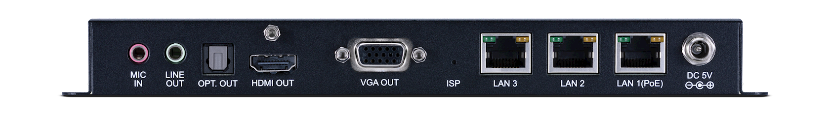 The video and audio can be transmitted via an IP network for distances up to 100m through a single network switch. The transmission distance can be further extended up to 100m between network switches and supports Gigabit networks.