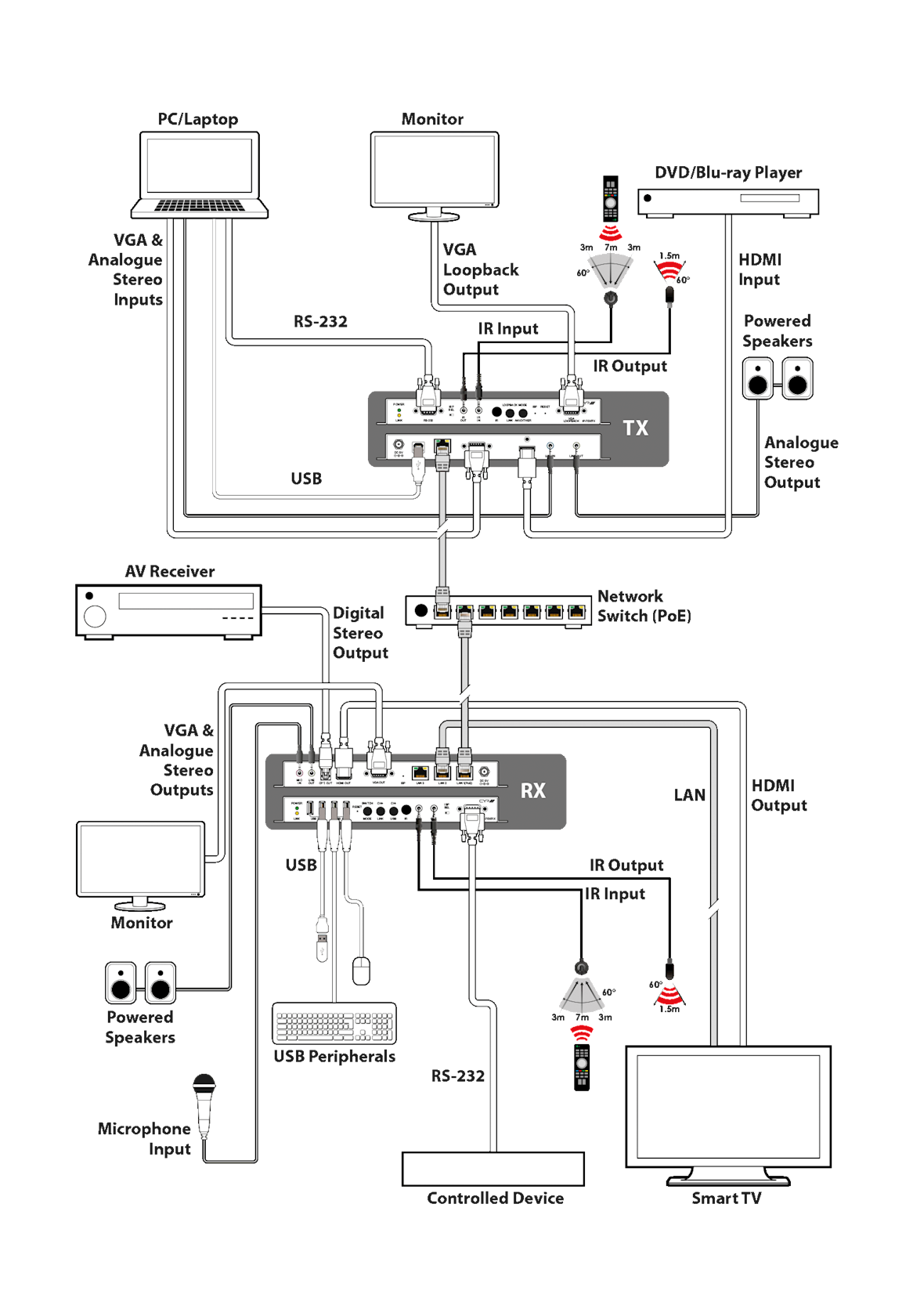 This system also features bi-directional IR pass-through, analogue line level in/out, and microphone input provide the user with variety of audio options. The USB function allows the system to act like USB hub which, when combined with the VGA input/Output feature, it allows the system to be used as a KVM switch. Adding extra devices allows the user to cascade the system enabling them to extend the transmission distance without signal loss or introducing delay.
