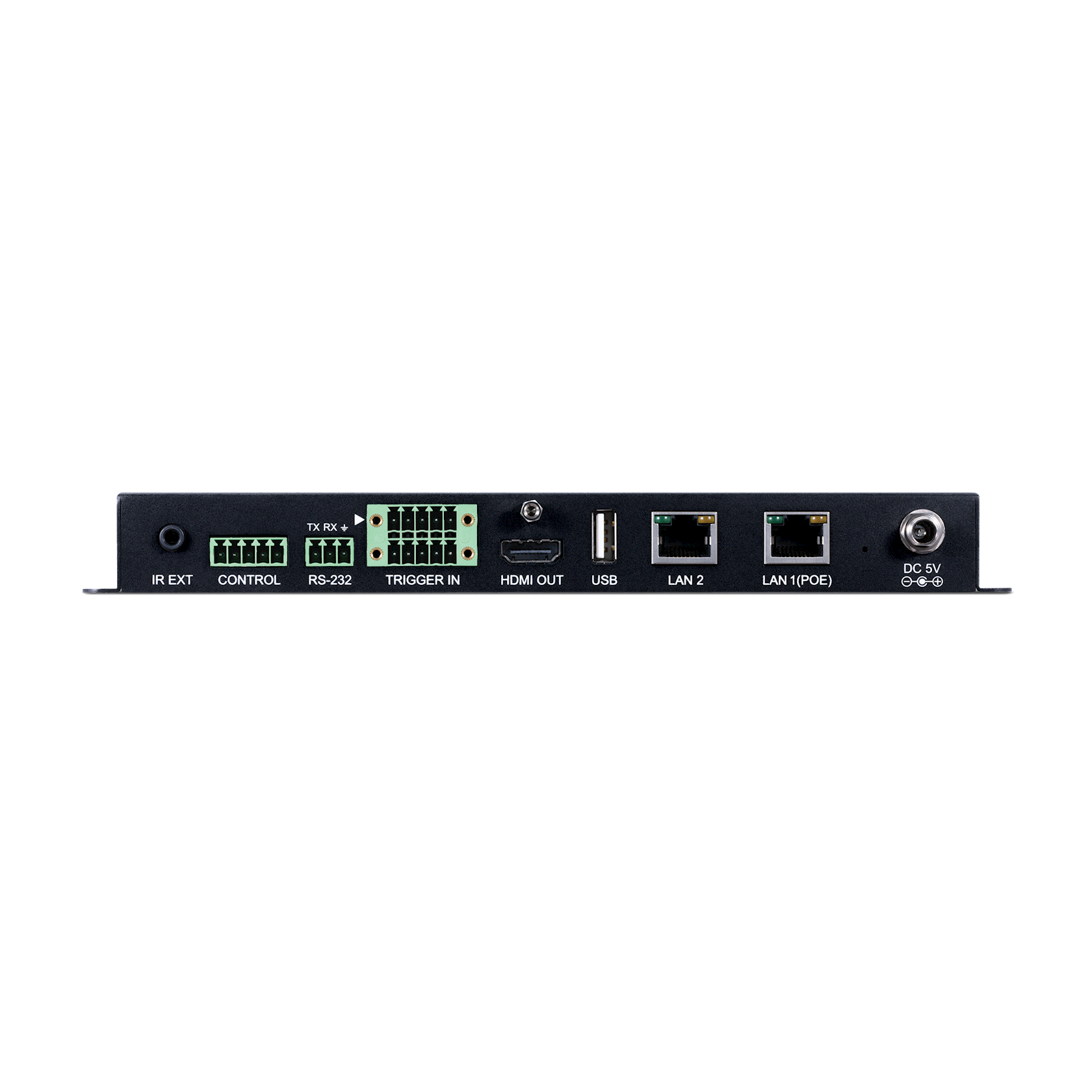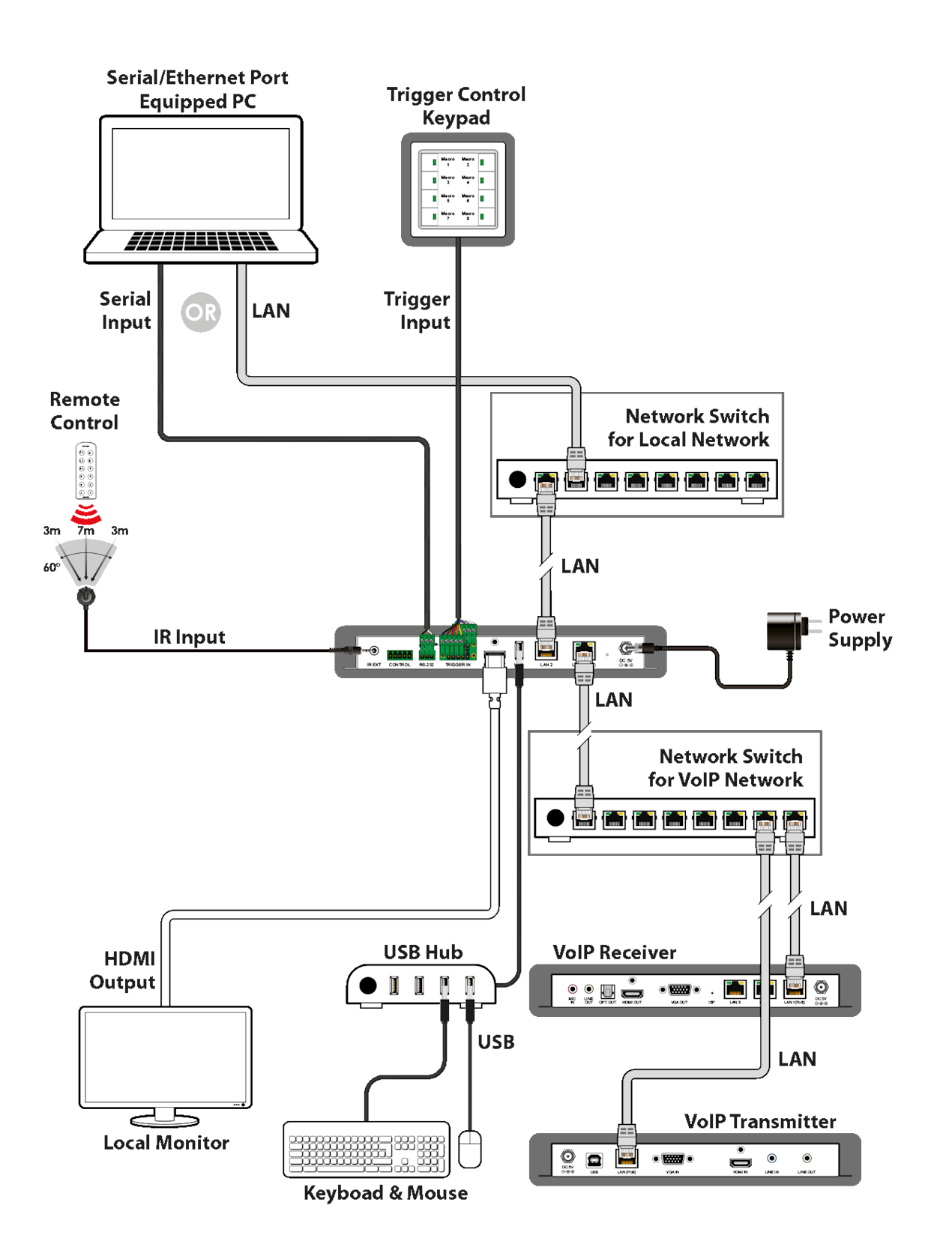 Using the WebGui the user has access to a 'Monitor & Control' area for simple drag and drop control and switching of sources. In this mode the user can see a preview of the content being delivered from the source. The system setup area of the WebGui has protected access rights so to prevent any changes being made to the system by other users. An alternative control method of the device can be achieved by using the Trigger Input interface. This interface allows the user to activate pre-defined functions or presets at the touch of a button. Standard control of the device can be achieved using RS-232, Telnet and the WebGui.