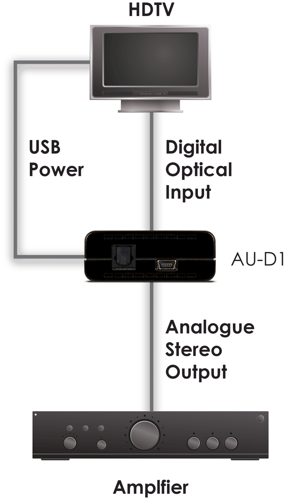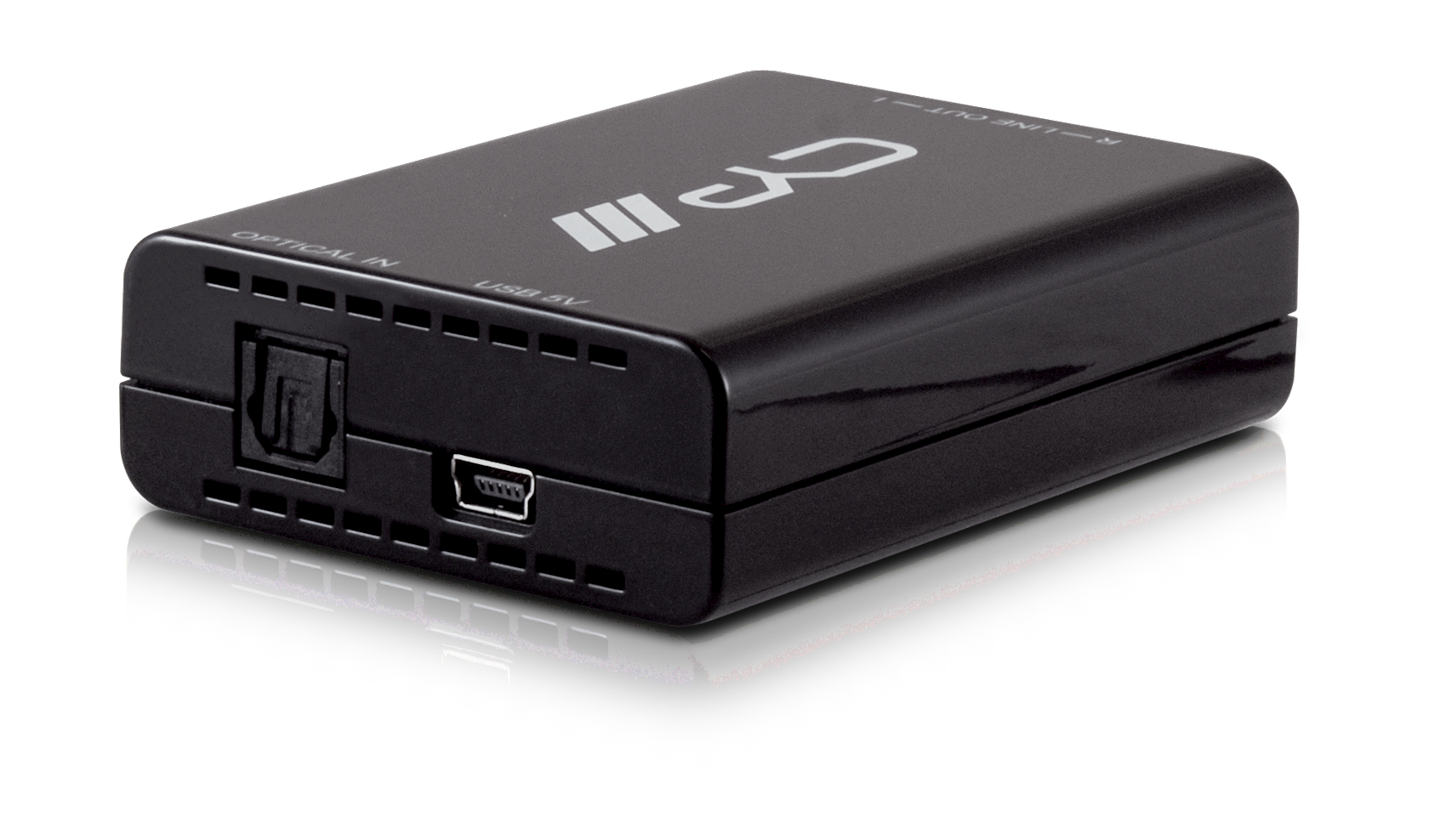 The AU-D1 is a digital to analogue audio converter (DAC) which allows the user to easily convert digital Optical signals to analogue L/R Stereo for connection to any AV receiver. With support for audio sampling rates up to 96 kHz/24-bit, it provides high quality sound conversion which is perfect for connecting the digital audio output from a TV to an analogue AV receiver or amplifier. This device is also perfect for use in digital recording systems, computer audio systems or digital mixing consoles and is powered from any USB port allowing it to be used with USB equipped HDTVs, Blu-ray players or computers without the need for a separate power supply. With many of the latest generation of HDTV's now only providing an optical audio output, the AU-D1 allows the user to easily integrate the digital audio signal into their AV receiver.