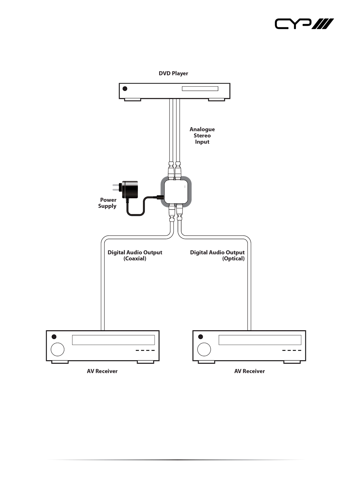 The AU-D4 is designed to convert analogue stereo audio to Digital Coaxial and Optical (Toslink) outputs simultaneously.