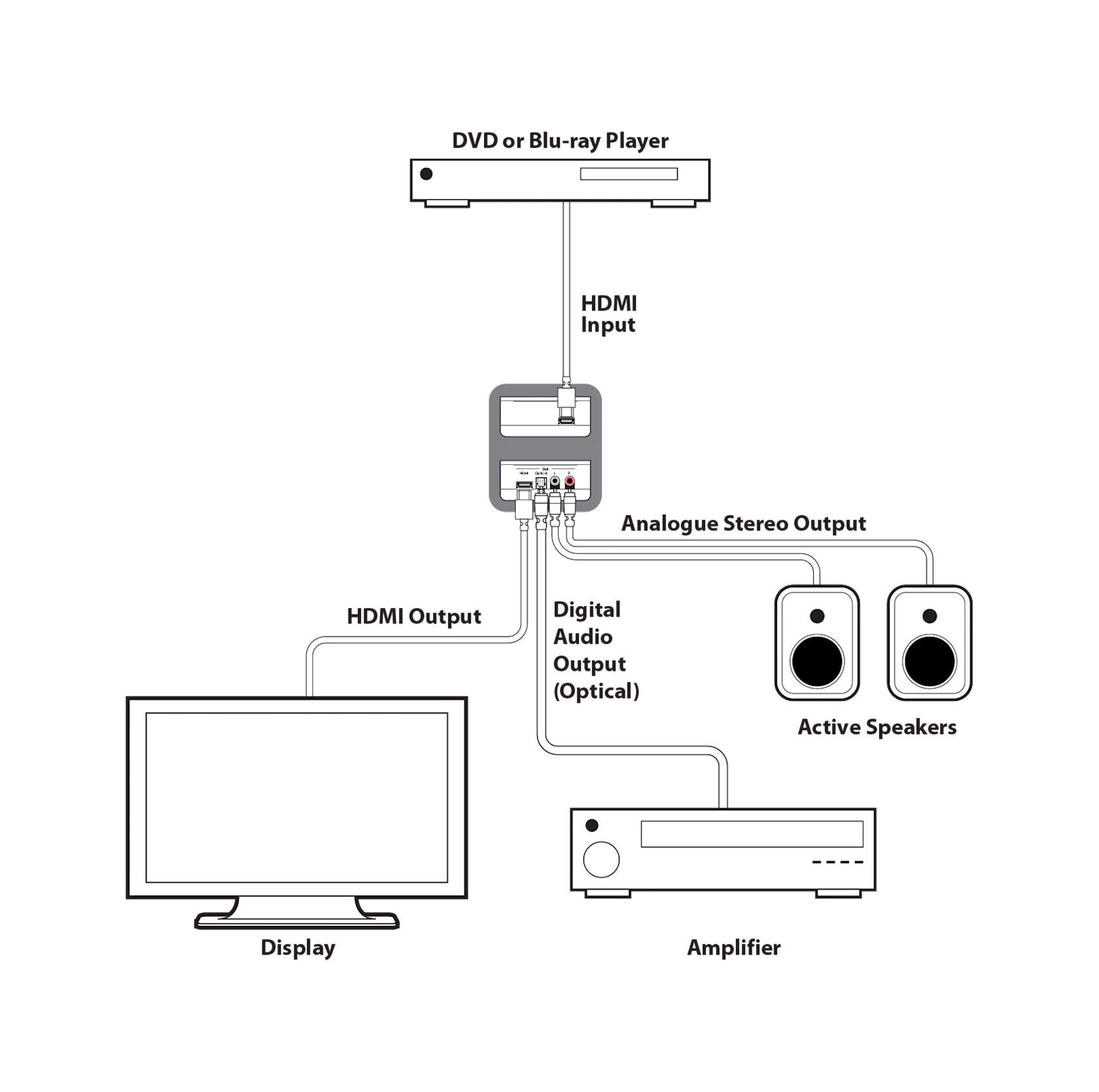 The AU-11CD is an advanced solution for repeating HDMI with integrated Audio de-embedding, up to 5.1. Connect the AU-11CD between your source and display via HDMI, and select the audio format required.