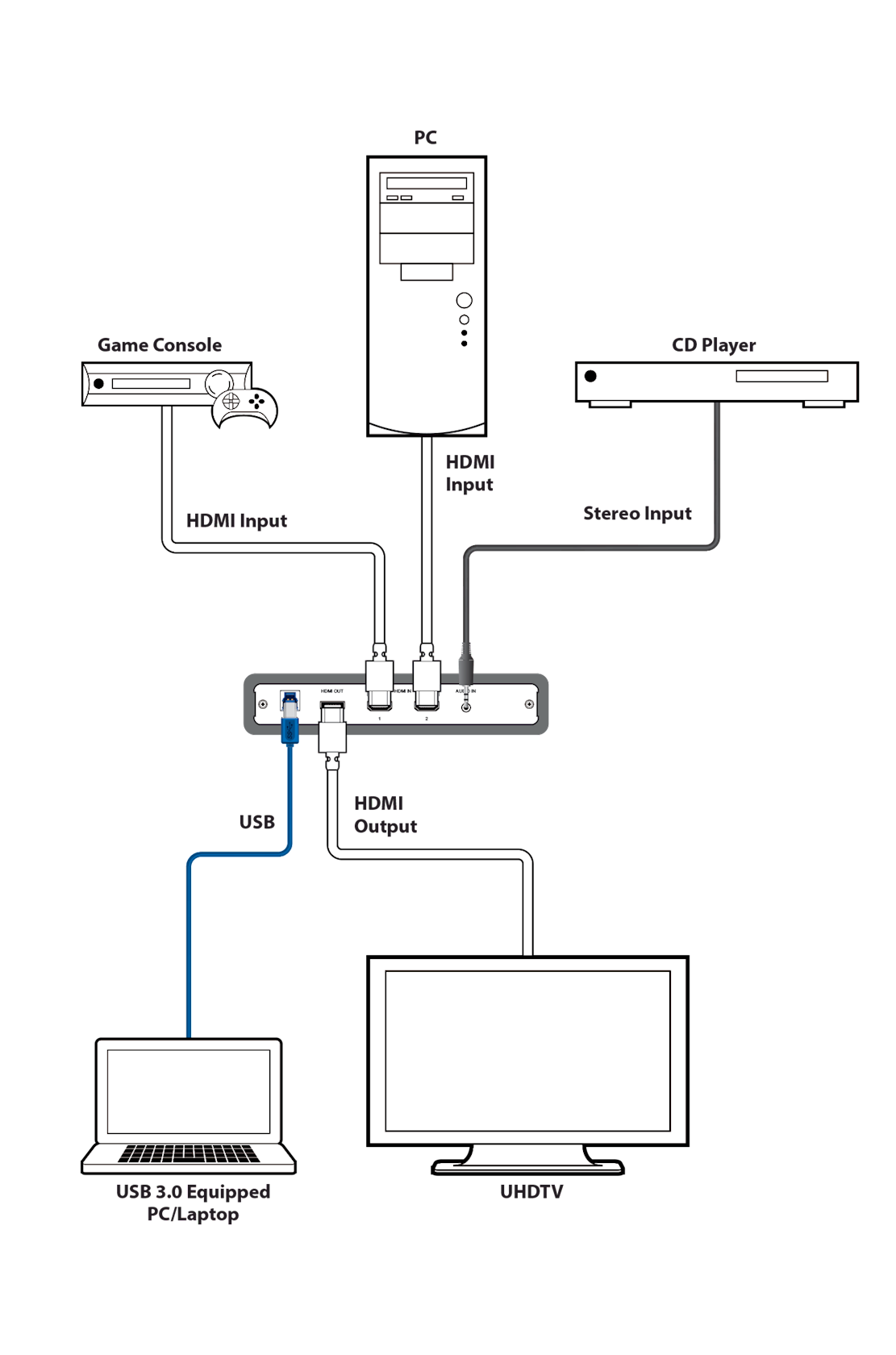 The SY-XTREAM-PIP HDMI to USB video capture / recorder with HDMI bypass can support resolutions up to 18Gbps (600Mhz) 4K UHD with HDR (via the HDMI bypass pathway) while simultaneously streaming the audio and video signal at 1080p to the USB connected PC for capture and re-broadcast.