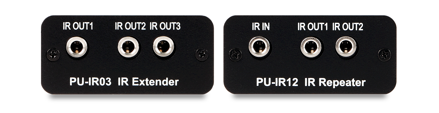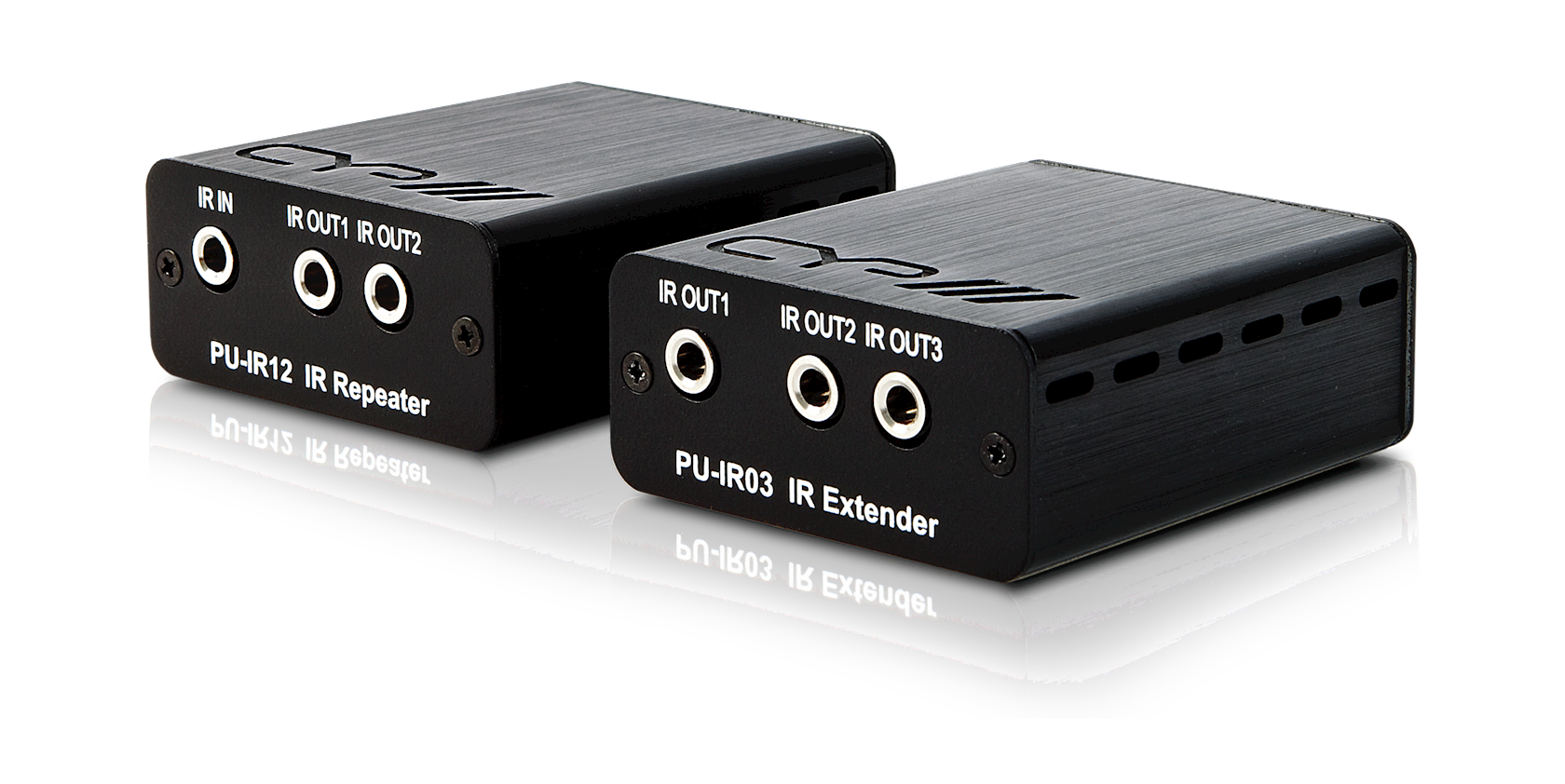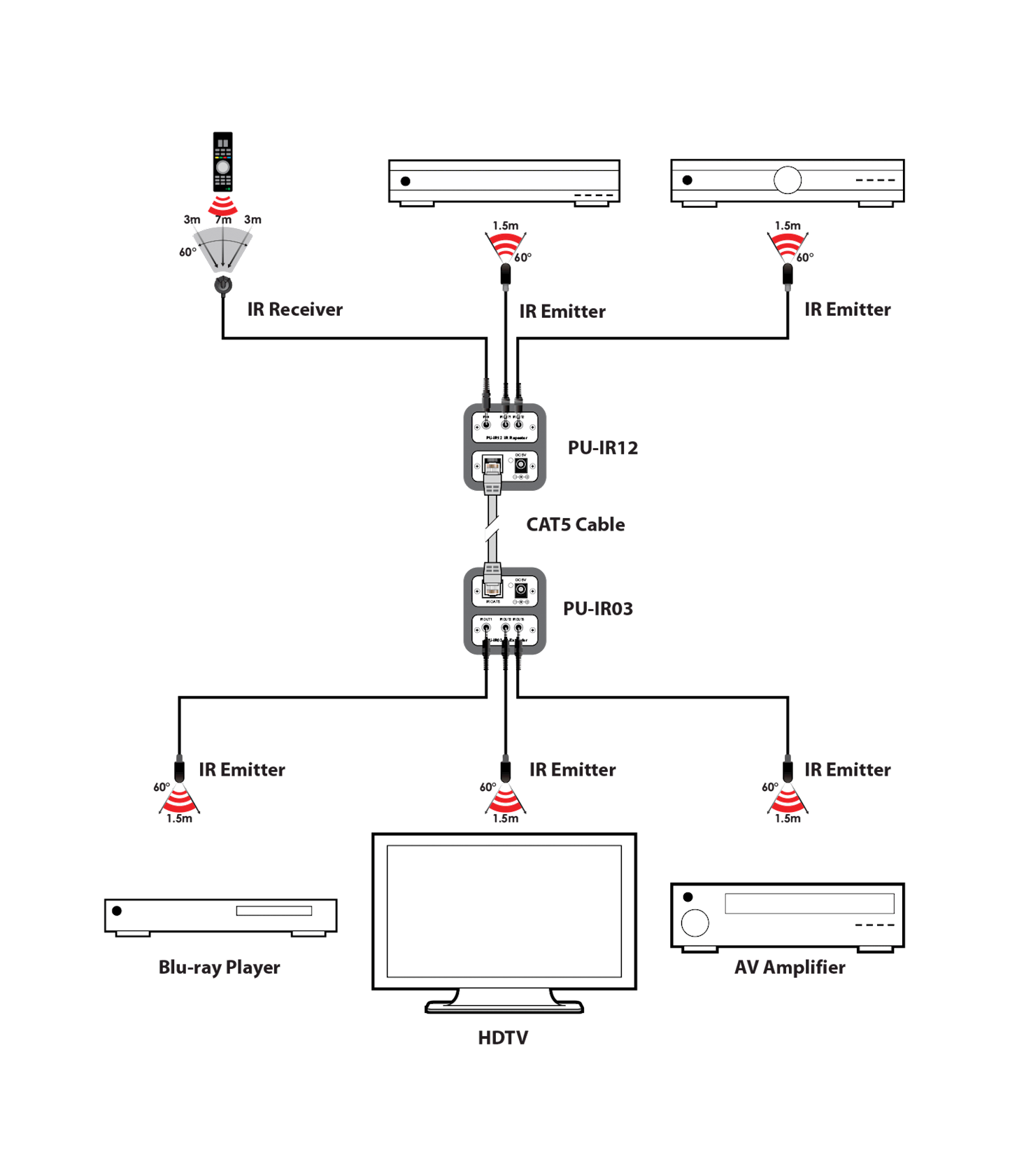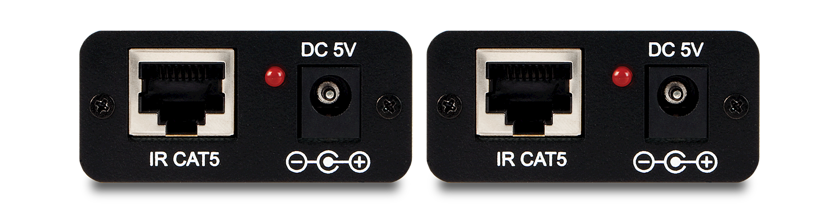 The IR Extender and the Repeater set is perfect for controlling IR controlled source equipment over long distances. Up to five sources can be controlled using this extender set. Two sources can be controlled located locally to the repeater, whilst the remaining three sources can be controlled locally to the extender, which can be located up to 250m away via CAT5/6 cable. This system allows for the sources to be controlled by their own original remote controls, from extended distances. A 5-eye emitter accessory can be supplied for additional control of extra source equipment.