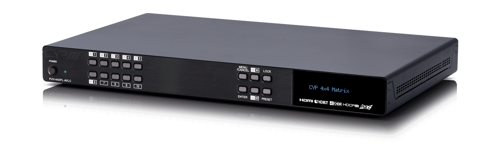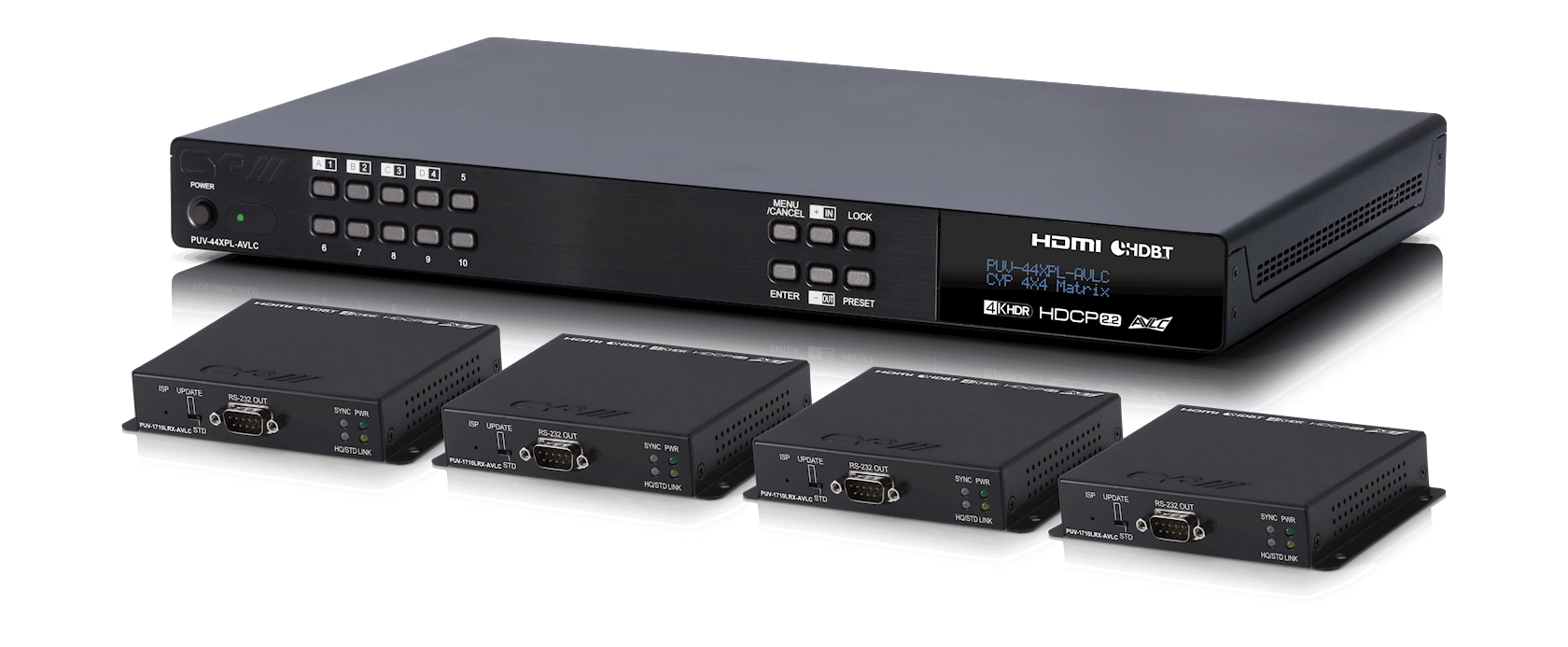 The PUV-44XPL-AVLC is the next generation of 4 x 4 matrices from CYP, taking much of its heritage from the successful PUV-44XPL-4K22. The Matrix supports the transmission of video (resolutions up to 4K UHD 10/12-bit HDR & Dolby Vision, HDCP 2.2, HDMI2.0) and multi-channel digital audio from 4 HDMI sources to 4 HDBaseT outputs. Despite the 10.2Gbps limitation of HDBaseT™ technology, this groundbreaking product enables data rates of up to 18Gbps to be transmitted using AVLC (Adaptive Visually Lossless Compression) Technology. The transmitter enables 4KUHD sources up-to and including 4K@60Hz (4:4:4 8-bit) as well as 10/12 bit sources with HDR (including Dolby Vision) to be extended to a compatible receiver included in the kit. The result is a perfect 4K 6G visually lossless image delivered to the display screen.