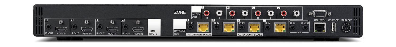 The PUV-44XPL-AVLC supports independent video output scaling on two of the HDBaseT outputs. This is particularly useful when transmitting a 4K HDR image from the matrix to a standard 1080p HD display within an AV setup.