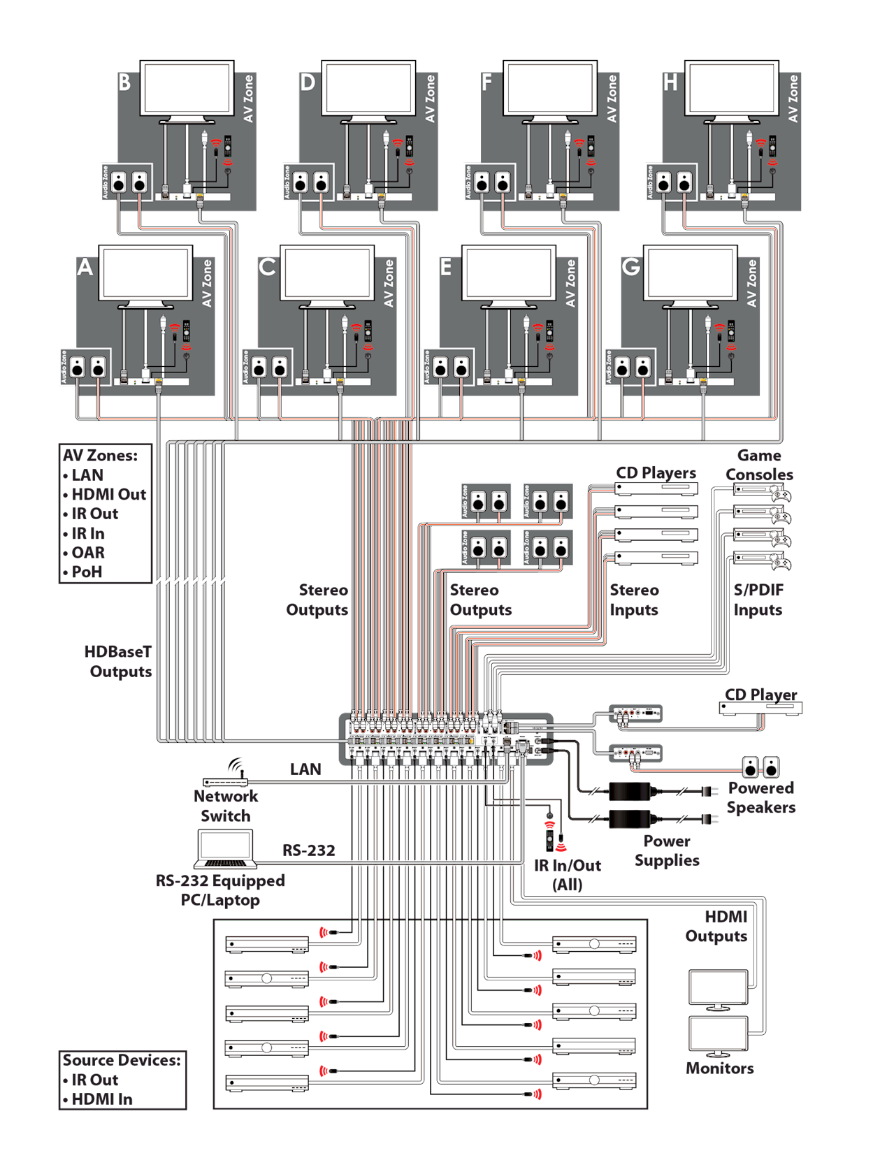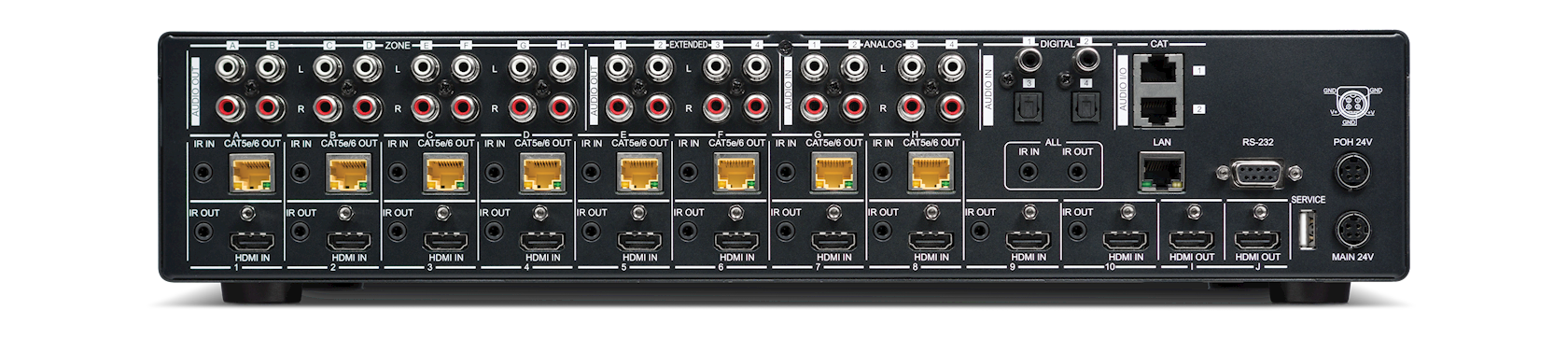 LAN connectivity provides a 100BaseT network for smart TVs or games consoles in every zone. The matrix has a built-in pattern generator which can be used to verify the video signal on any of its 10 output ports. The Power over HDBaseT (PoH) function provides power to compatible receivers.