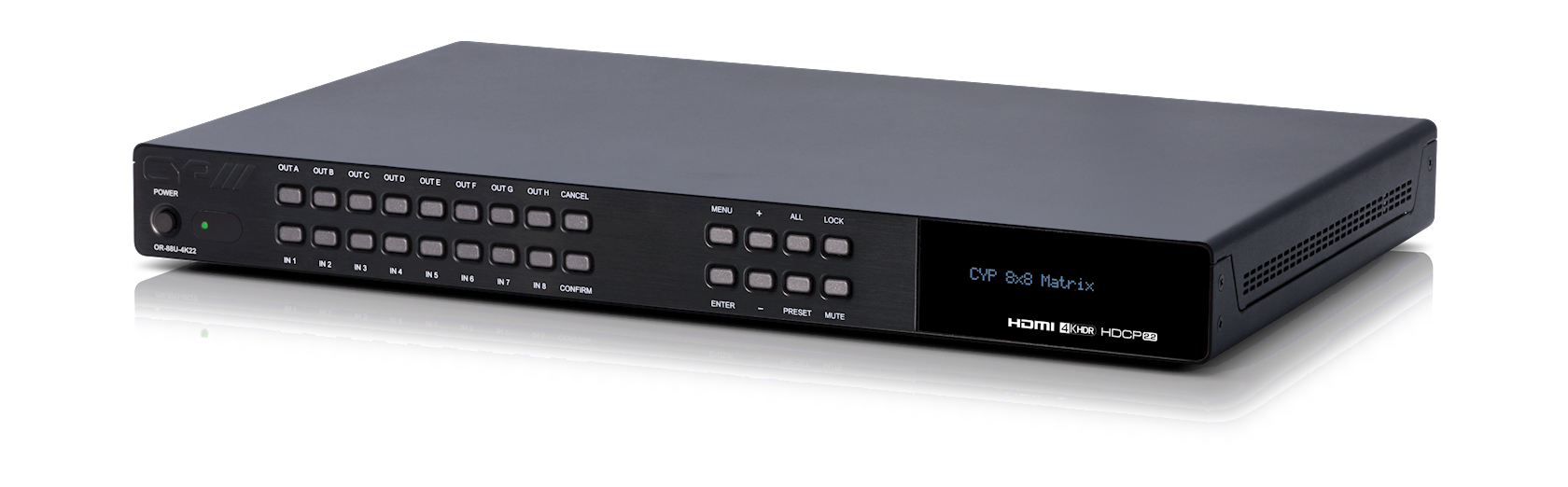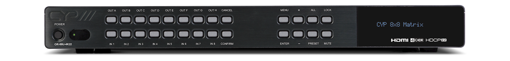 The OR-88U-4K22 8x8 Matrix provides the ability to connect up to eight 4K UHD HDMI sources to up to eight 4K UHD HDMI displays and freely switch between them. This unit comes with full support for 18Gbps (6G) resolutions up to, and including 4K@60Hz (4:4:4, 8-bit) as well as support for 16-bit Deep Color up to 1080p@60Hz, HDR (High Dynamic Range), HD audio and other features defined by the HDMI 2.0a specification. With a comprehensive EDID management feature that includes the ability to select between built in default EDID, copied EDID from connected sink devices, as well as a configurable EDID, this matrix can solve many inter-connectivity problems.