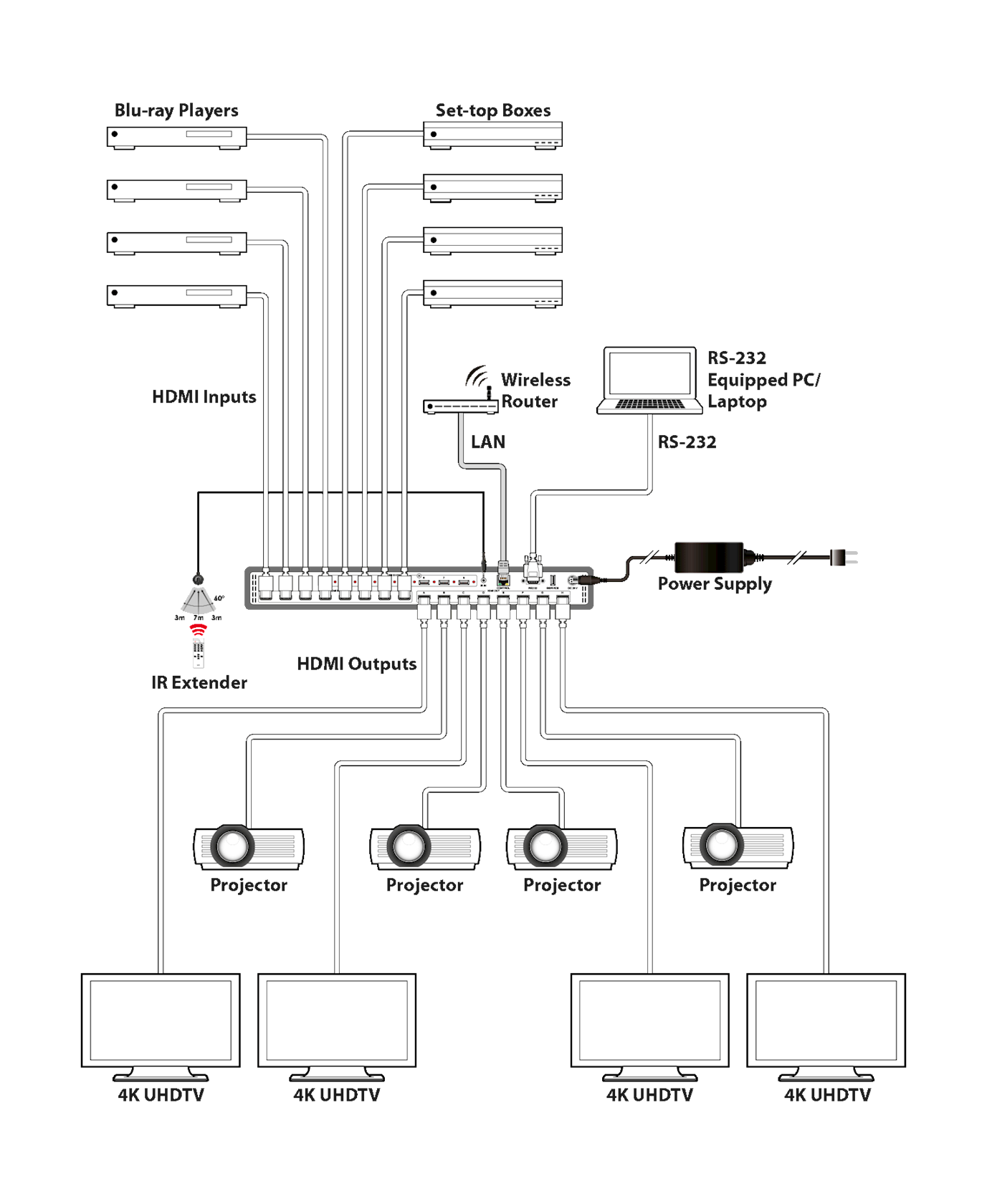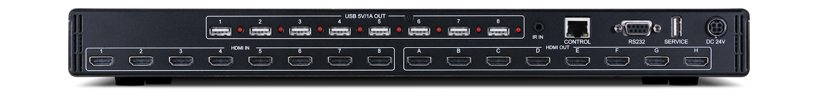 This unit also features eight USB ports which supply up to 5V/1A power for use with connected AOC (Active Optical Cable) fiber cable extenders. By using these specialized cables your HDMI content can be extended much further than would be possible with normal HDMI cables. The built-in OSD has the ability to display user defined text, enabling each output to display 2 lines of custom text on top of the video source in the color of your choice. This unit provides an intuitive set of front panel controls with an LCD, RS-232, Telnet, WebGUI, and IR remote control options.
