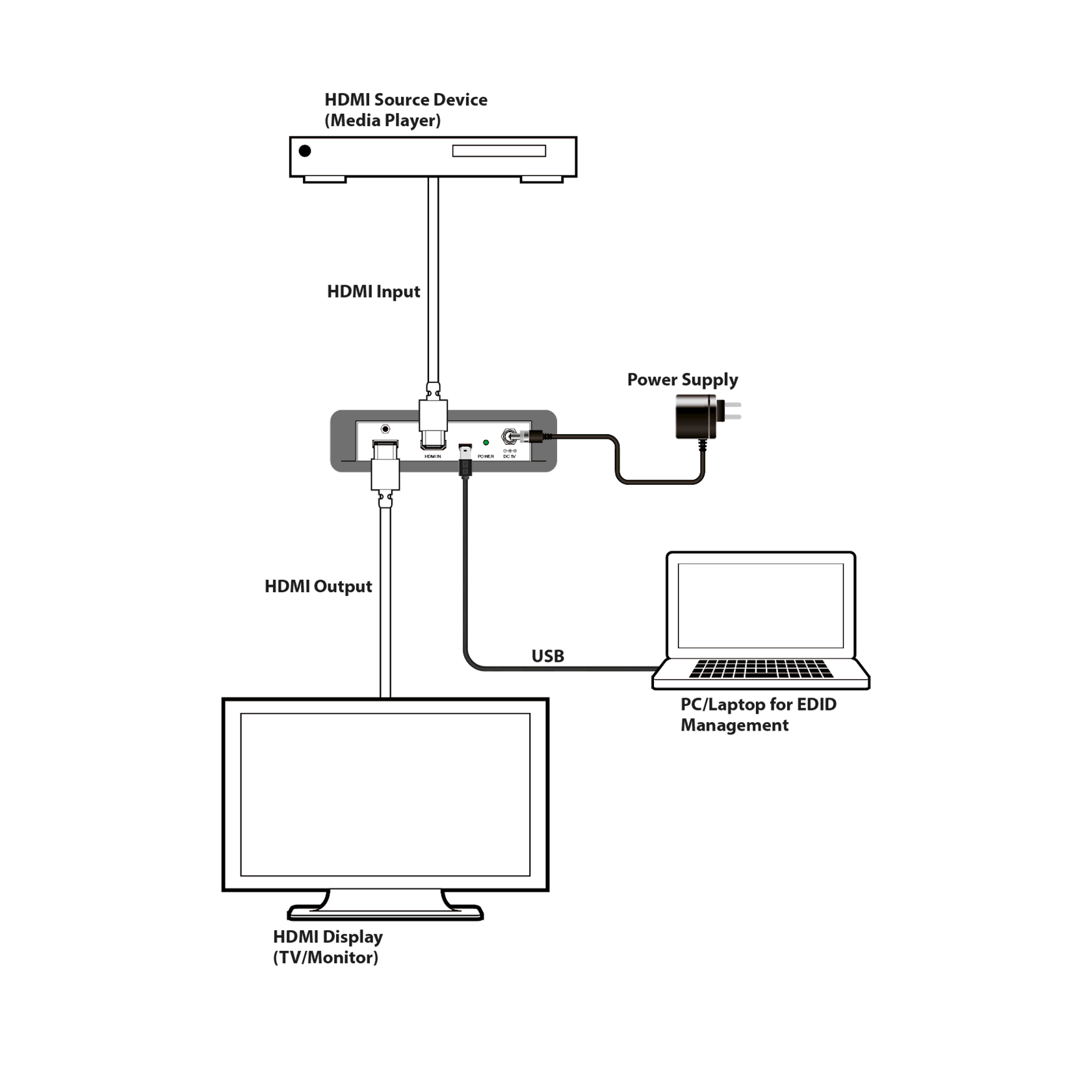 The RE-EDID-4K22 is designed to manage and manipulate the HDMI/DVI EDID information provided to a HDMI source device by a connected display. EDID contains critical information about the capabilities of the connected display, including audio and video format support, HDMI feature support, etc. This product aims to simplify the technical complications that often arise when performing video system integration, home cinema installation, integrating commercial displays or audio/video equipment testing. It also supports EDID Emulation and Bypass modes. This device is perfect to overcome source and screen compatibility issues, particularly when integrating PC's into an AV system.