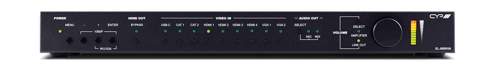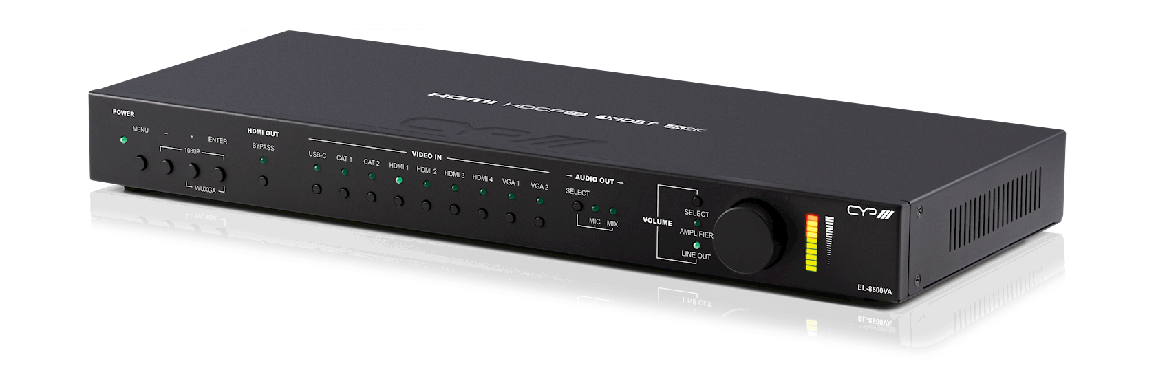 The EL-8500VA is a multi-format scaling HDMI, USB Type C, HDBaseT, and VGA input presentation switch, which allows the user to output at a scaled resolution of the user’s choosing over the mirrored HDMI and HDBaseT outputs. The HDMI and USB-C ports support resolutions up to 4K@60 (4:4:4, 8-bit) while the HDBaseT output supports automatic down-conversion of 4K60(4:4:4) sources to 4K60(4:2:0). The VGA inputs support resolutions up to WUXGA. The HDBaseT output provides a great solution to extend your audio and video up to 70 meters (at 4K) over a single run of Cat.5e/6/7 cable as well as providing 48V PoH power to compatible HDBaseT Receivers.