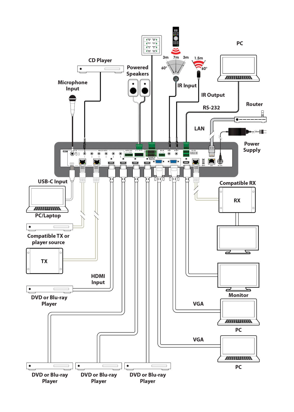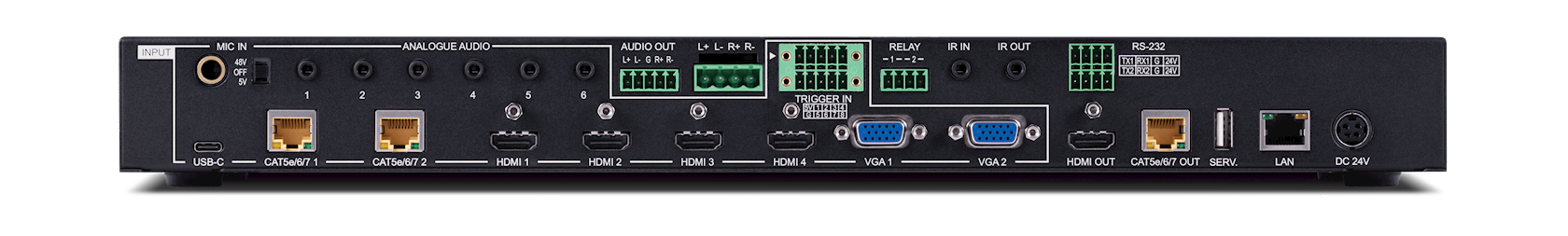 A trigger input interface is also provided to allow the easy addition of a remote control keypad, or other trigger-supporting products, which can be installed within a podium or within a table in a conference room or classroom. This interface can allow the user to activate functions with the simple press of a button. Standard control is available via front panel buttons with an On-Screen Display (OSD), WebGUI, Telnet and RS-232.