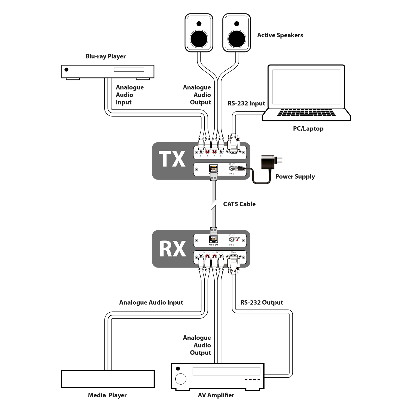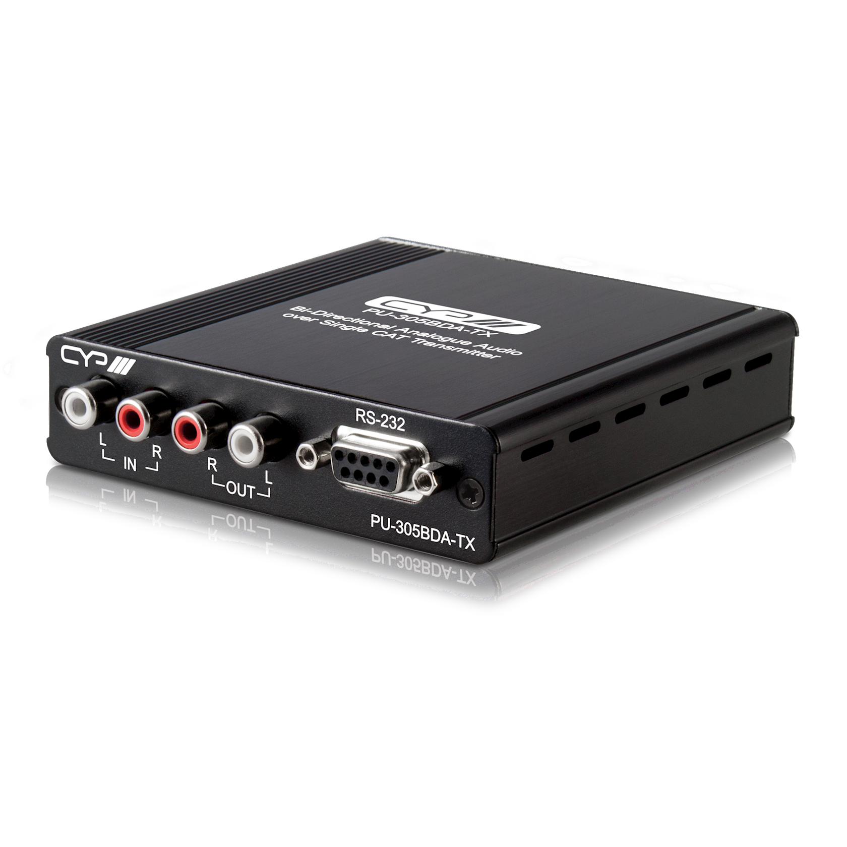 The PU-305BDA-TX is an analogue Stereo over CAT5e/6/7 Transmitter which can send and receive analogue audio signals over a single run of CAT5e/6 cable up to 300m. It has the added benefit of RS-232 pass-through allowing control of devices and the Power over Ethernet (PoE) function can power the receiver unit eliminating the need for a second power supply. As the unit has bi-directional capabilities, this device can also receive audio signals back from the connected receiver.