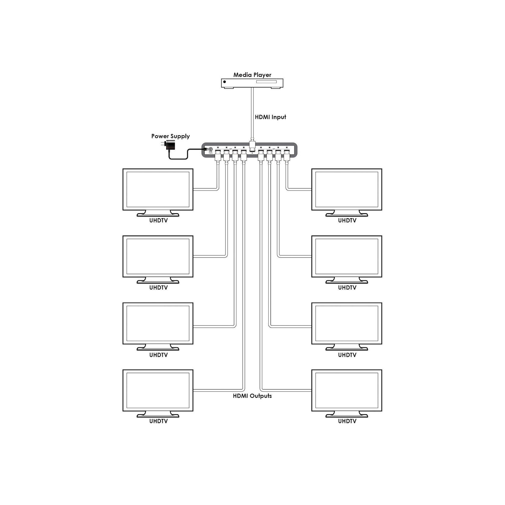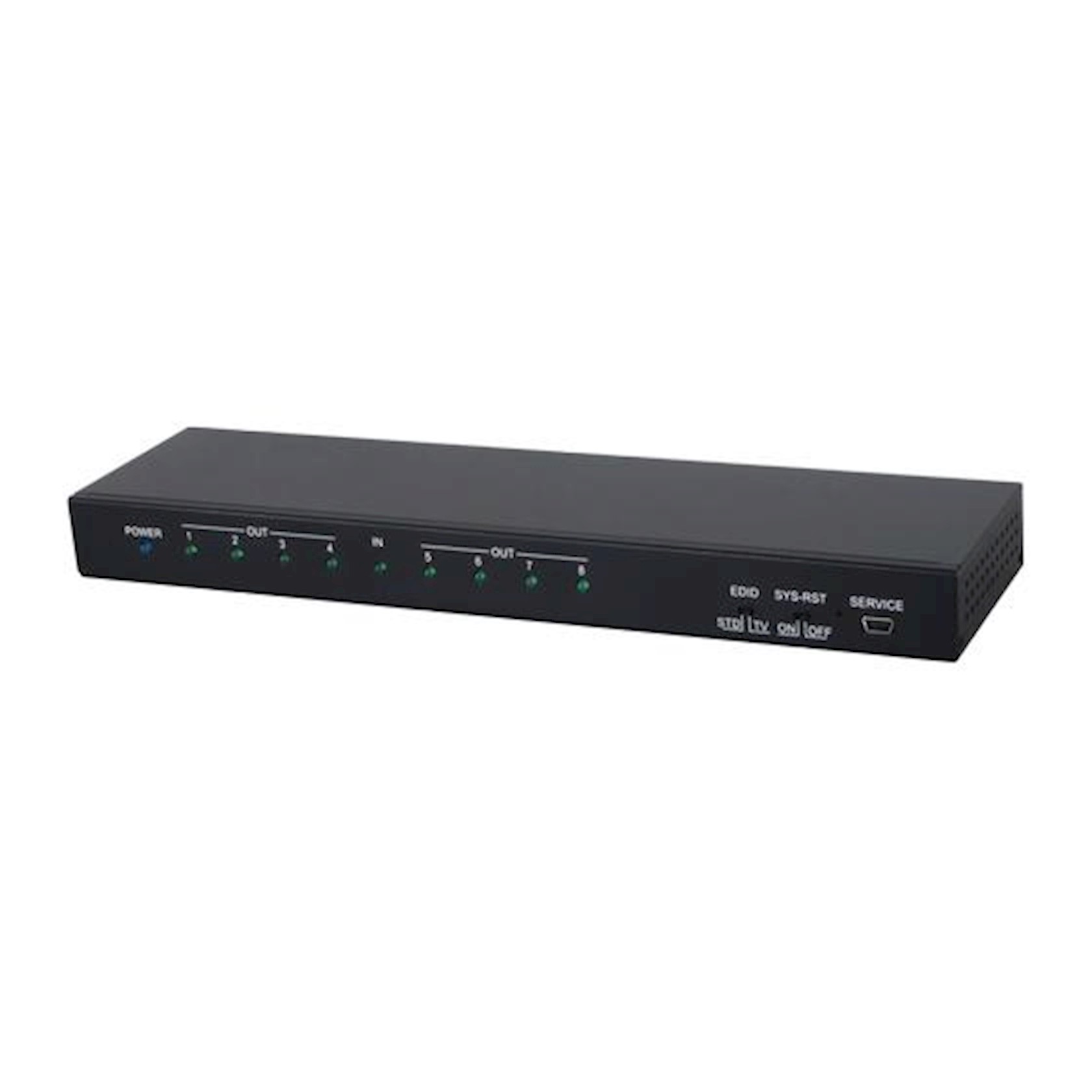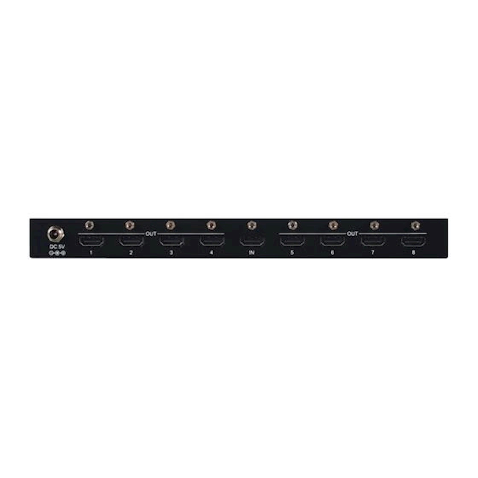 The QU-8MS Distribution Amplifier (splitter) accepts one HDMI input and splits this signal to eight identical outputs. This device is compatible to v1.4 HDMI specifications, supporting resolutions up 4K30 / 4K50/60 4:2:0, High definition digital audio formats such as LPCM 7.1, with audio sampling rates up to 192kHz, Bitstream, and HD Bitstream. The QU-8MS has standard EDID management and the System Reset functionality.